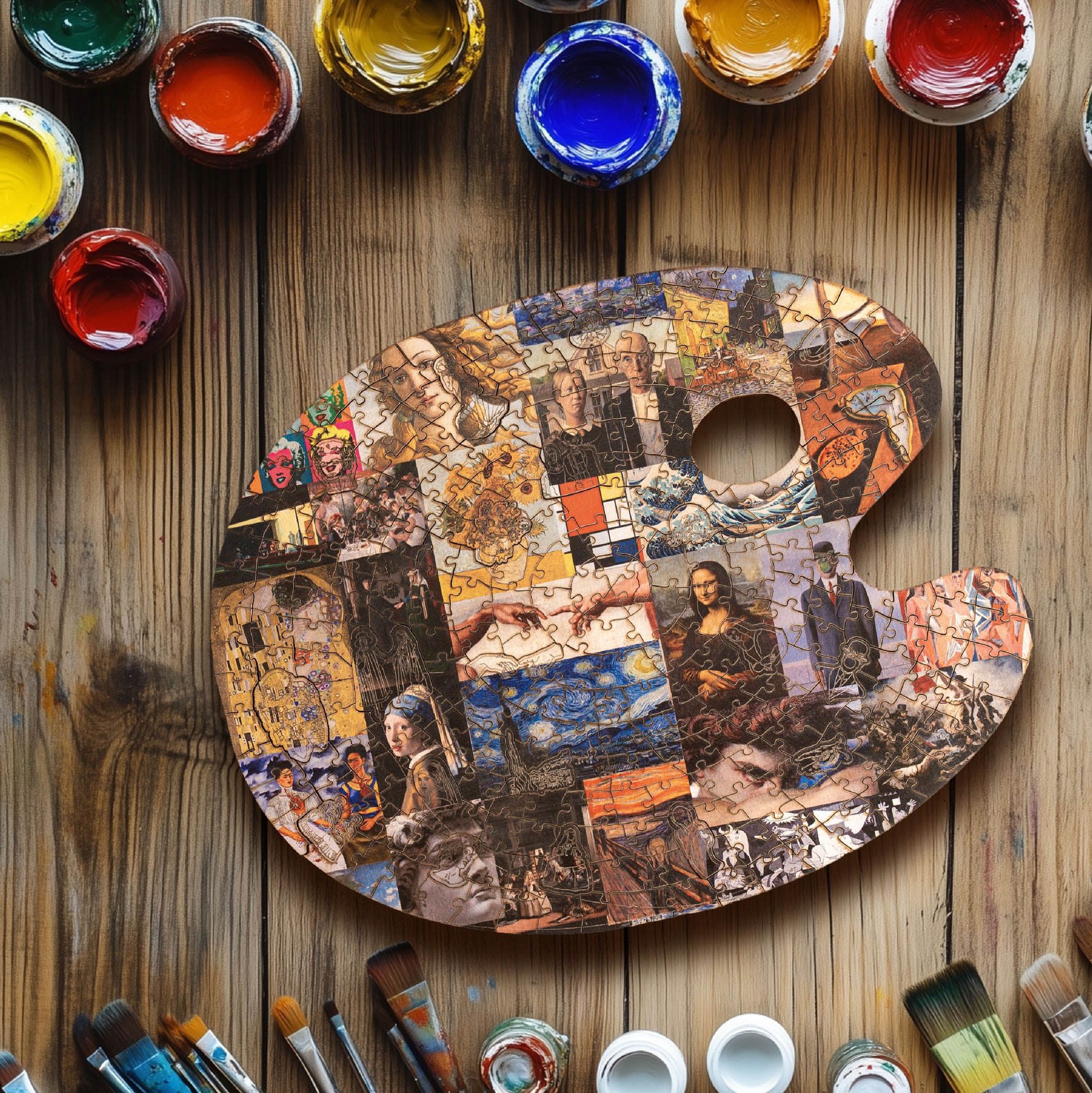 Un rompecabezas único en forma de una tabla de artista, lleno de detalles vibrantes. Cada pieza forma una galería con grandes obras maestras como La Mona Lisa, La noche estrellada y más. Ideal para los amantes del arte, este diseño celebra la creatividad y el legado de los genios de la pintura. 🎨🖼️
