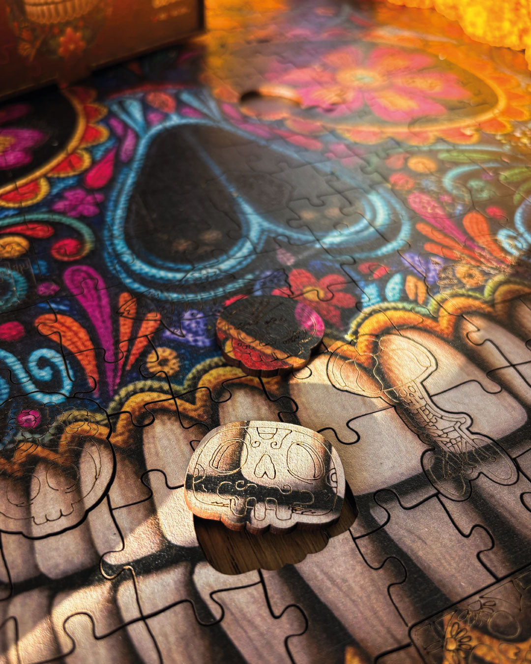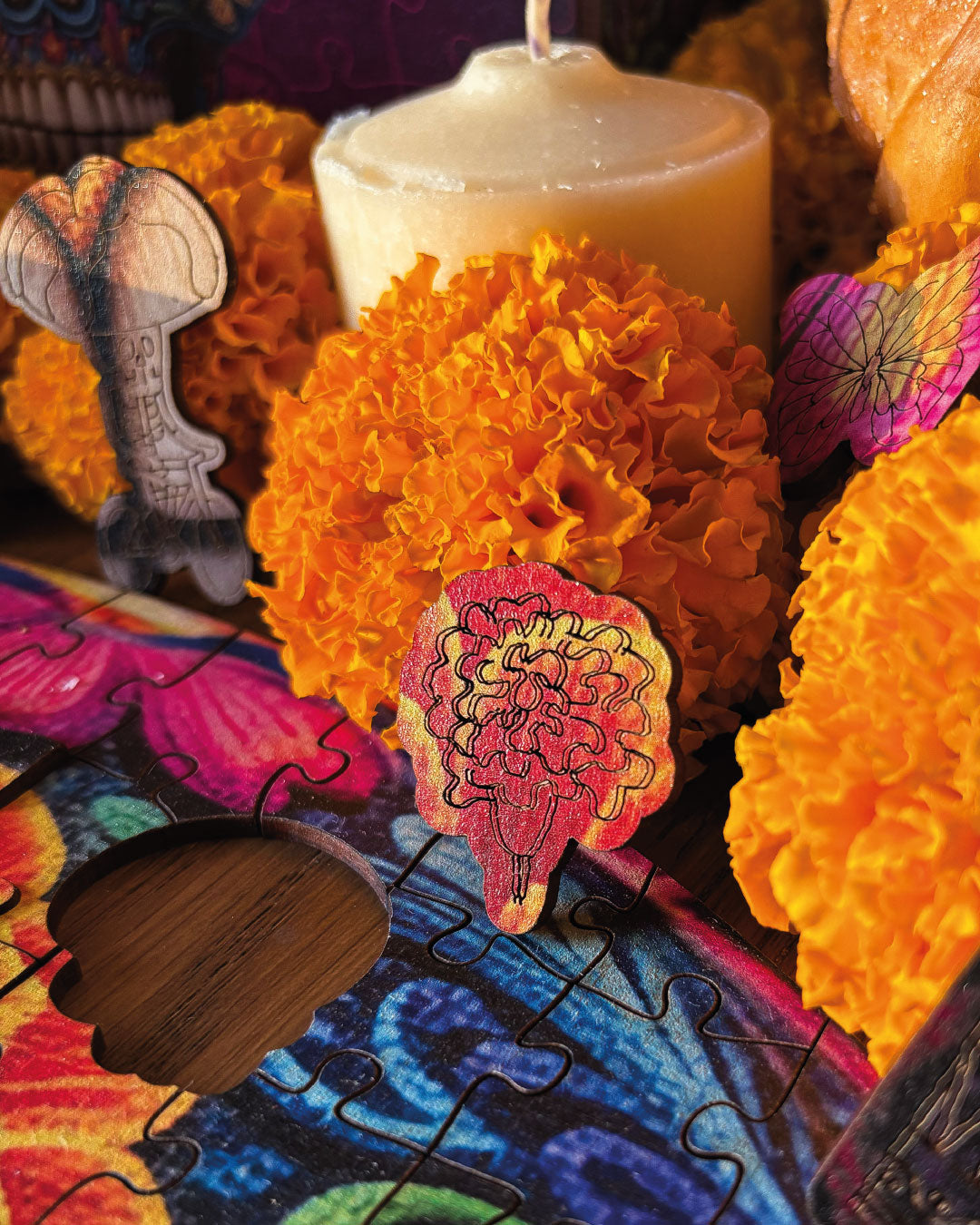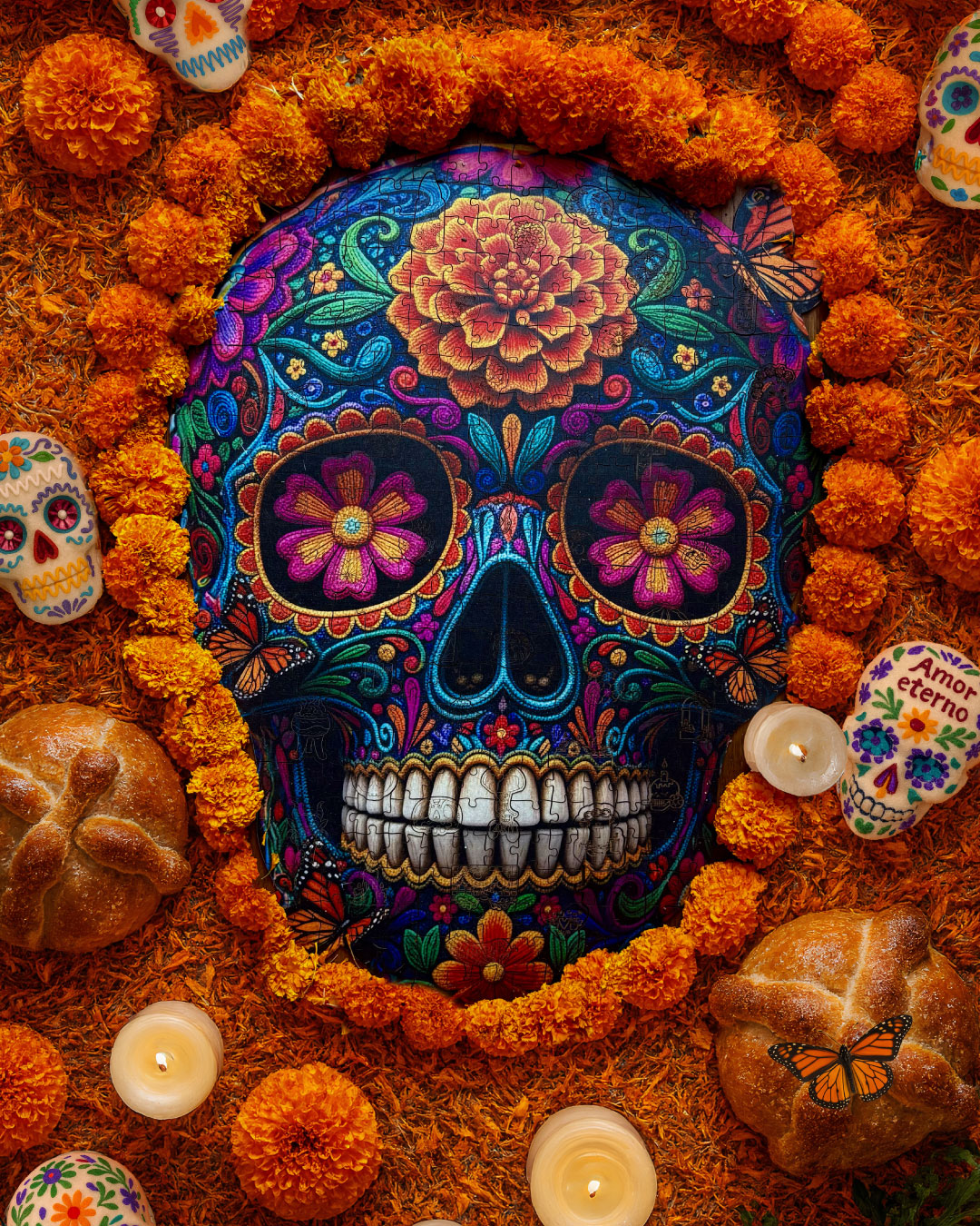 Celebra el orgullo de nuestras raíces con este rompecabezas inspirado en una de las tradiciones más bellas de México: el Día de Muertos. Cada pieza honra el color, la vida y la memoria de quienes amamos, con formas especiales que representan flores de cempasúchil, calaveras de azúcar, velas, pan de muerto y corazones —símbolos que nos conectan con la esencia de esta celebración ancestral.